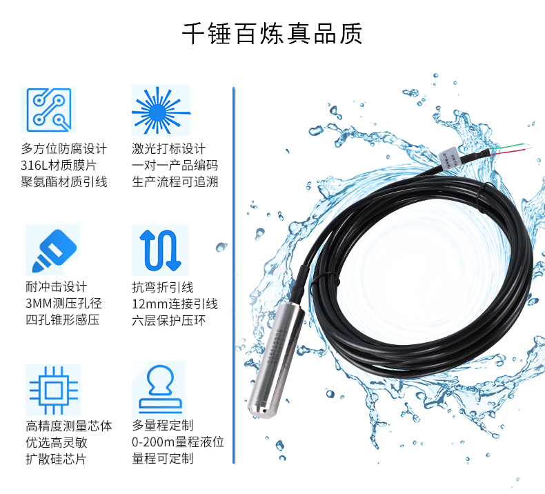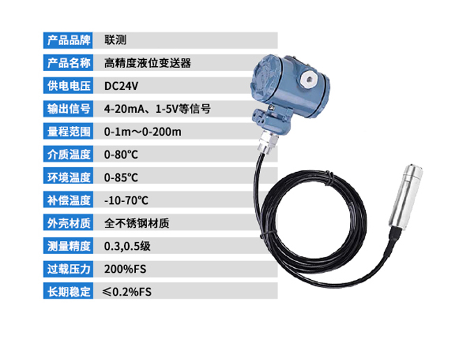 SIN-P261投入式液位變送器由高性能擴(kuò)散硅壓阻式壓力傳感器作為測量元件,把與液位深度成正比的液體靜壓力準(zhǔn)確測量出來,并經(jīng)過信號調(diào)理電路轉(zhuǎn)換成標(biāo)準(zhǔn)(電流或電壓)信號輸出,建立起輸出信號與液體深度的線性對應(yīng)關(guān)系,實(shí)現(xiàn)對液體深度的測量。產(chǎn)品精度高、體積小,直接投入液體中,即可測量出變送器末端到液面的液體高度,使用方便。適用于石油、化工、電廠、城市供水、水文勘探領(lǐng)域的液位測量與控制。經(jīng)過長期老化及穩(wěn)定性篩選,產(chǎn)品性能穩(wěn)定可靠,能夠適用應(yīng)用于環(huán)境比較惡劣的露天現(xiàn)場,同時(shí)能夠現(xiàn)場液位顯示,零點(diǎn),滿程可遷移。