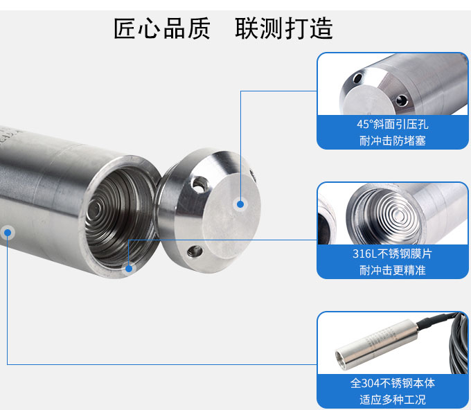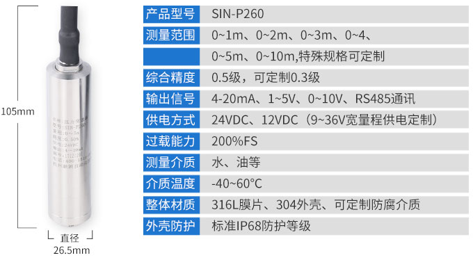 SIN-P260投入式液位變送器SIN-P260投入式液位變送器由高性能擴(kuò)散硅壓阻式壓力傳感器作為測量元件,把與液位深度成正比的液體靜壓力準(zhǔn)確測量出來,并經(jīng)過信號(hào)調(diào)理電路轉(zhuǎn)換成標(biāo)準(zhǔn)(電流或電壓)信號(hào)輸出,建立起輸出信號(hào)與液體深度的線性對應(yīng)關(guān)系,實(shí)現(xiàn)對液體深度的測量。產(chǎn)品精度高、體積小,直接投入液體中,即可測量出變送器末端到液面的液體高度,使用方便。適用于石油、化工、電廠、城市供水、水文勘探領(lǐng)域的液位測量與控制。經(jīng)過長期老化及穩(wěn)定性篩選,產(chǎn)品性能穩(wěn)定可靠,能夠適用應(yīng)用于環(huán)境比較惡劣的露天現(xiàn)場,同時(shí)能夠現(xiàn)場液位顯示,零點(diǎn),滿程可遷移。